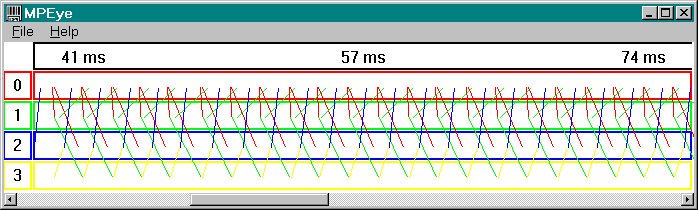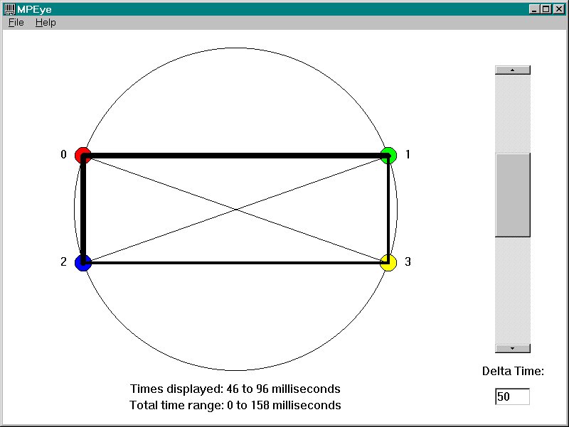 The message timings graph allows the user to see each message that was sent and its timing relative to other messages. This makes it easy to isolate bugs and performance issues related to the timing an number of messages. For example, if it would be more efficient to send fewer messages with more data, it will be apparent from this graph. The view is split up into nproc horizontal bars, each representing one of the processors and outlined with a unique color. Across the top is a bar showing the time scale and the elapsed time from when the program started. For each message, a line is drawn ranging vertically between the middle of the sender's bar and the middle of the receiver's bar and horizontally between the time the message was sent and the time it was received. The line is colored the color of the sender's bar, and its width depends on the size of the message. The amount of data corresponding to each pixel of line width is, of course, adjustable.